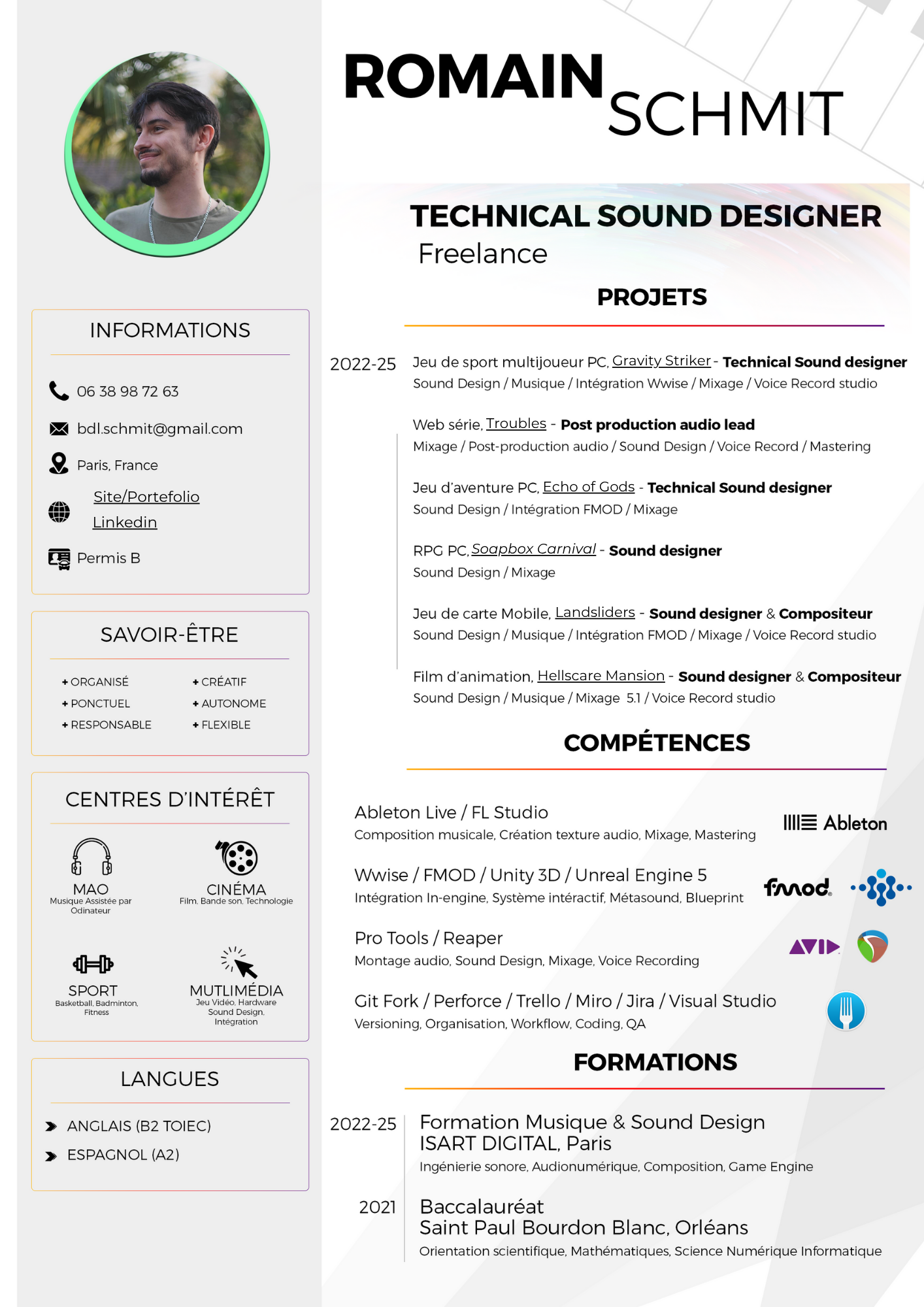 Je m’appelle Romain Schmit, Sound designer et Technical Sound designer en freelance. Passionné depuis de nombreuses années par l’univers sonore, je n’ai cessé de me perfectionner dans ce domaine aussi technique que créatif!